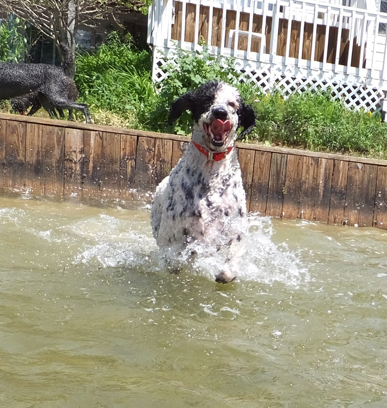 Sweet Reba! She sure loves swimming! She brings back all the balls (we throw four out at a time)that Rene and Nicole ignore. She and Parris are happy to collect the balls floating away. After a half our the old girls are exhausted! Old gals are in good shape for their age (Reba 13 this year, Parris 11 years) My precious girls!!