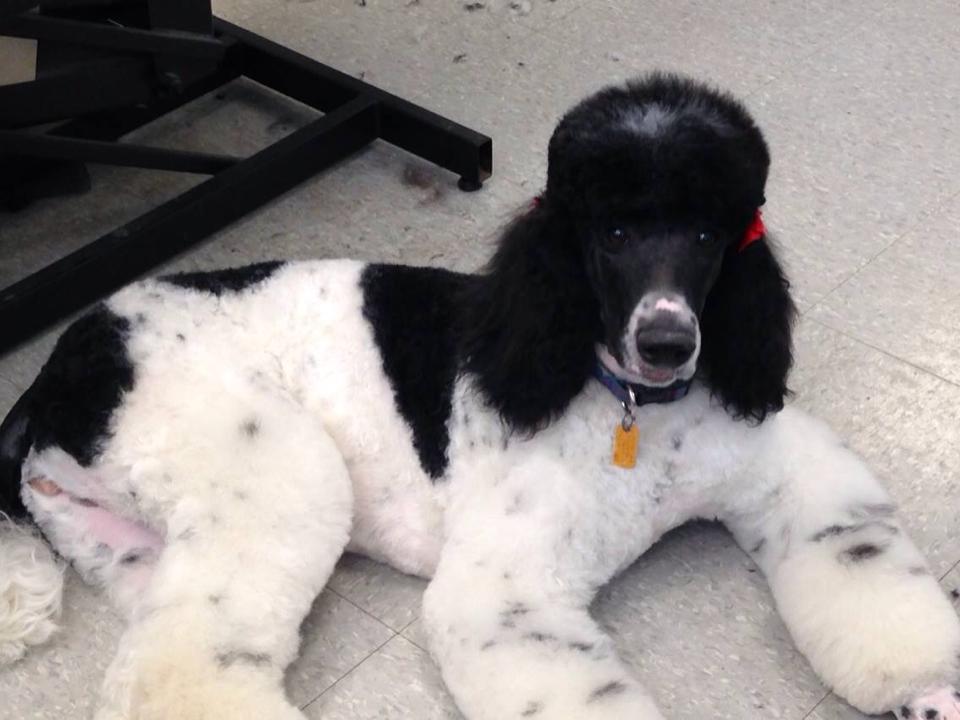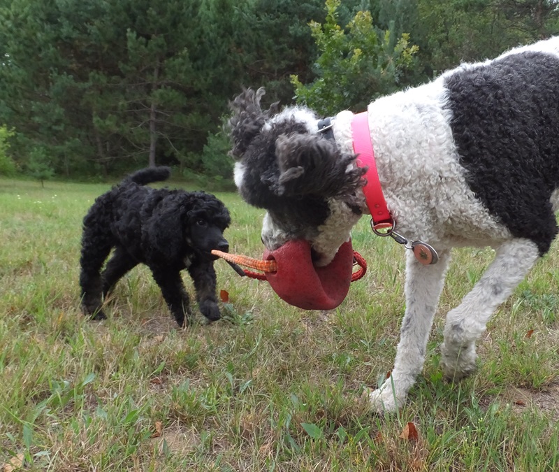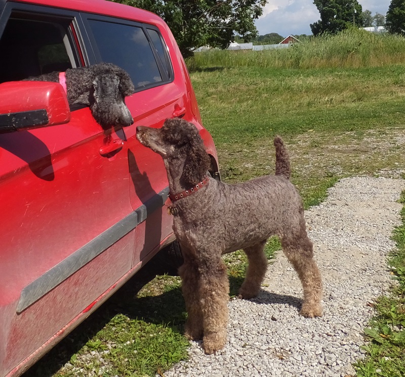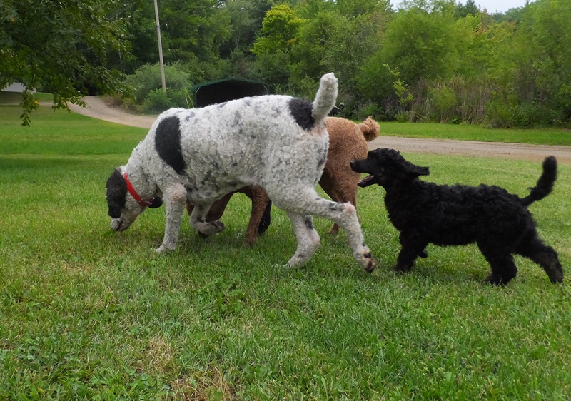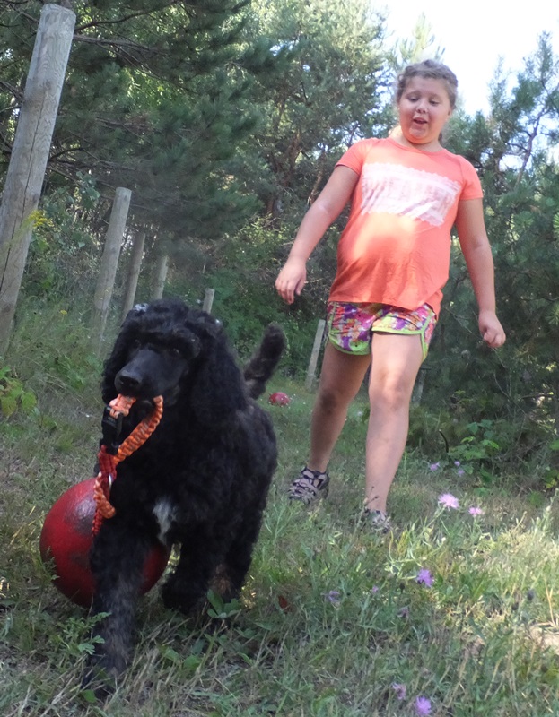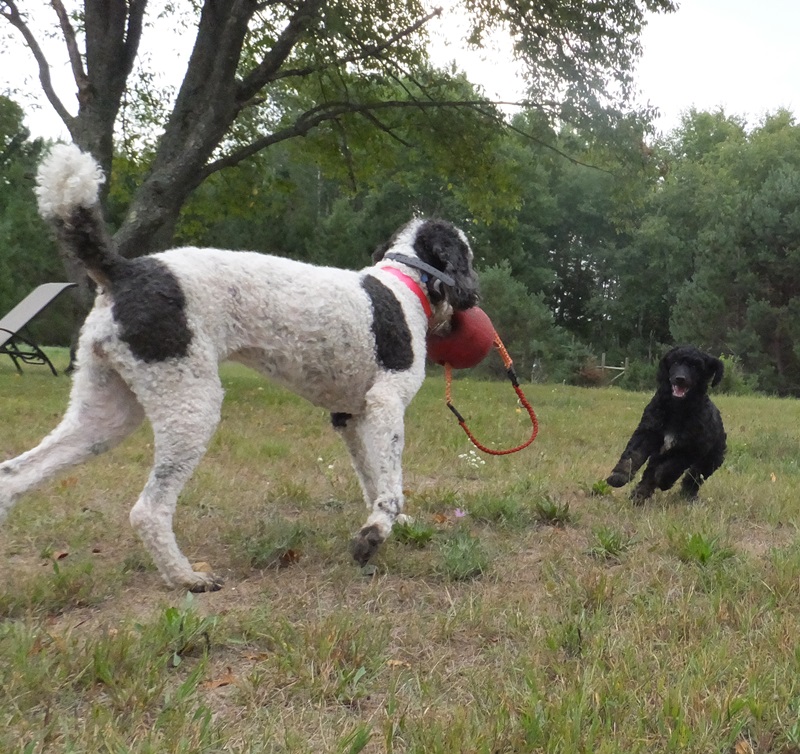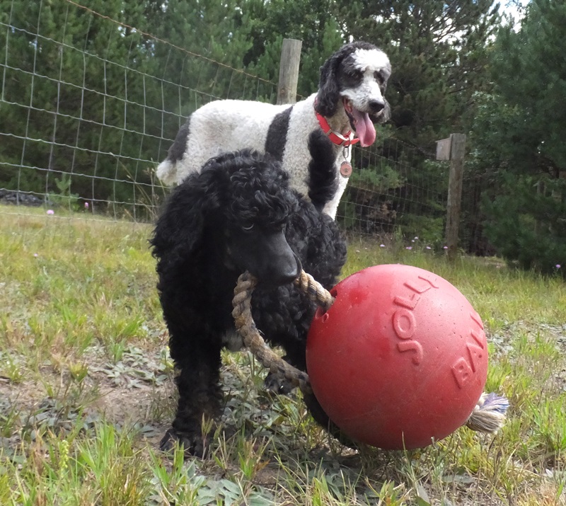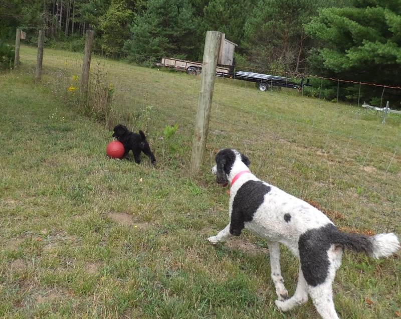 Dennis discovered Nicki’s ball and she’s actually letting him play with it 🙂 It’s as big as he is but he drags it around and is so proud of himself. Adorable little guy. He really loves Harlee.  I am looking for a poodle partner home (I want to keep him a little while so he knows us and the girls) he would be a family pet except for the couple times a year we need him as a stud muffin usually overnight. I don’t charge my partners for the pup but do have some food/shots and travel requirements. Let me know if you know someone not too far away that would be interested in giving Dennis a loving SPOILED HOME!Â