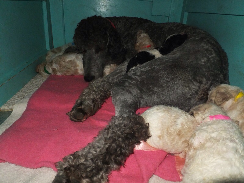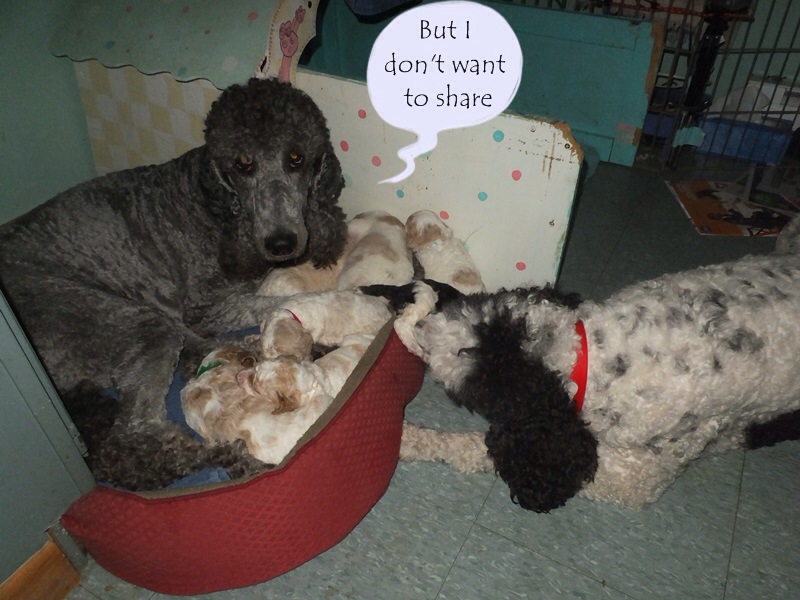 Grace has stolen the babies and she does NOT plan on sharing. She growls at Dottie, shows her teeth to Patti Sue and wakes me up in the middle of the night to go see them! I’m so sad for Grace, she wants babies of her own, what a great mom she’ll be. She is in there all day with them and only comes out on her own to go to the park π she cleans them, cuddles them and guards them. She tries to get them to nurse ( poodle pacifier) what a goof she is! Thankfully Dottie is willing to share.