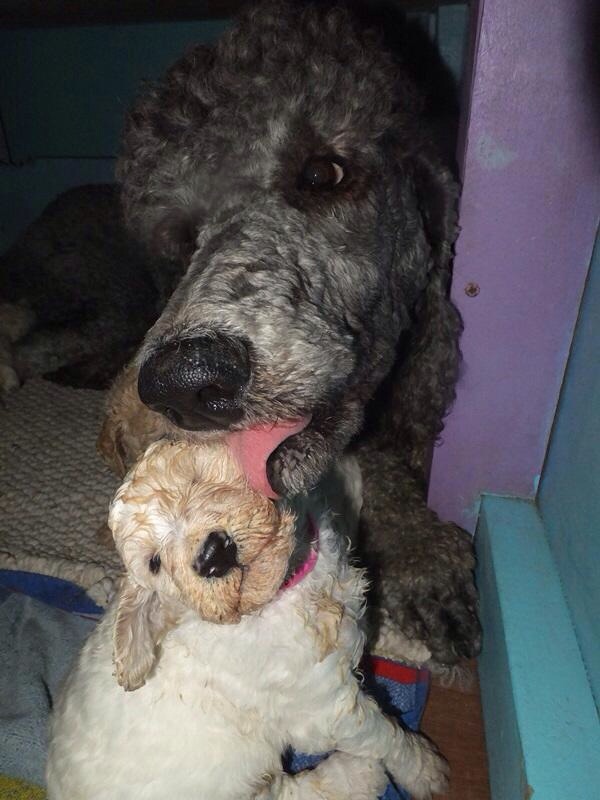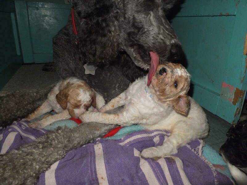 My sweet Gracie. She gladly cleans up our messy babies and as a bonus finishes the goo. She licks so hard she knocks them over haha. She has not met Rene’s babies yet. Rene doesn’t seem eager to share her babies. She tolerates me feeding them. She has been a really good mom, second only to Poppy ( who gently nipped our visitors to remind them they do not have permission to reach for her puppies). We are enjoying puppy breath!!