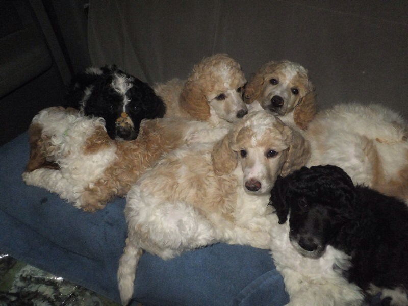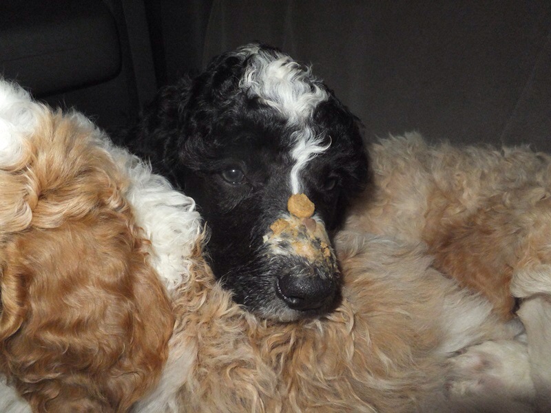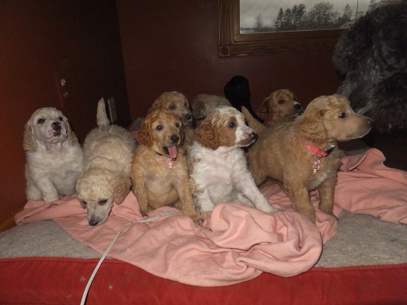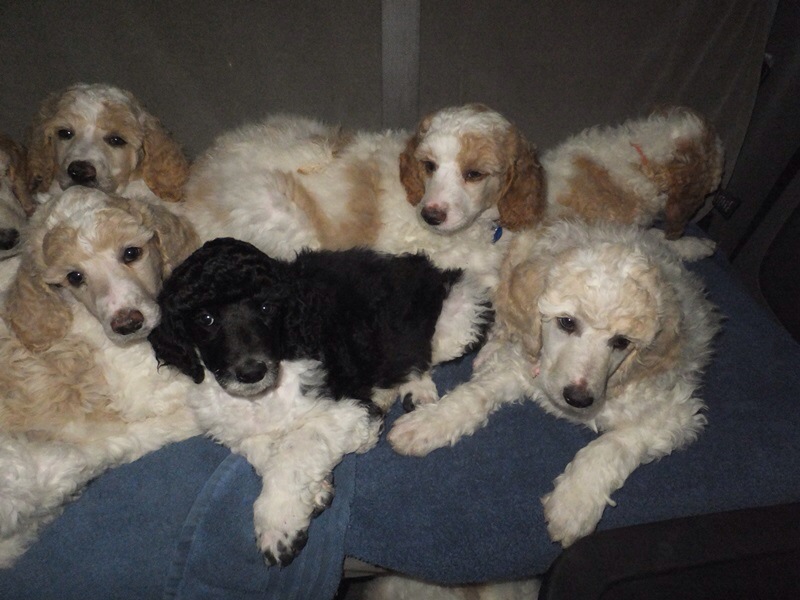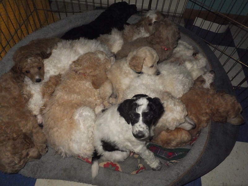 Everybody is doing great. I love seeing the little heads among the bigger ones. I’m always amazed at how they change in just twelve days! They have a heating pad in the crate but they cram themselves in this bed. So darn cute!!