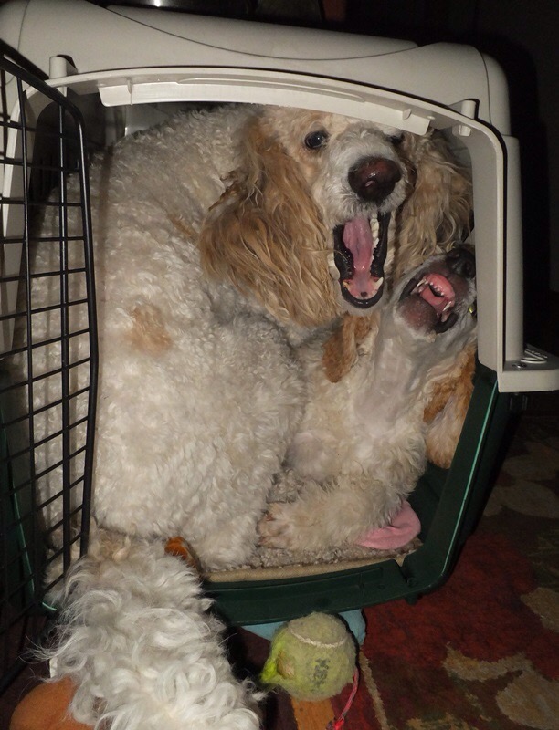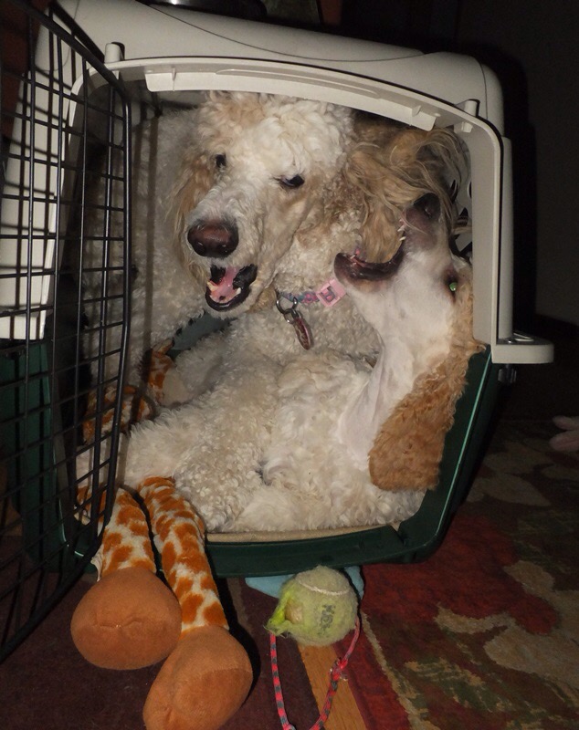 Such silly girls!! Haha, crammed into the crate, that thing was just a rockin! I love how poodles play, it is very different from other breeds. Lots of mouth fights and rearing up on back legs. I could watch them all day. People will comment that their dog is not aggressive, how can you mistake play for aggression? Their entire body (except for teeth) conveys fun. Poodles are FUN! And puppies are even more fun😀