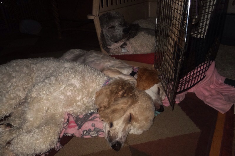 JoDee looks so cute (although I miss her fuzz ball hair) she was so hot in the house 😕 if it gets cold I’ll put a coat on her, although they go out every couple hours they are not out for very long. We haven’t had an accident in the house in weeks. I moved them up to my bedroom at night, they sleep in a crate in my walk in closet. They get me up between 1:30 and 2:30 to potty then settle back in until 5:30-6:30 the second they cry PARRIS comes over and nudges me to wake me up ( I try to ignore all of them as long as I can) good crate training too, they are happy to be upstairs with us.