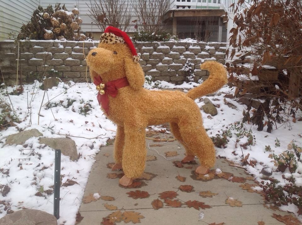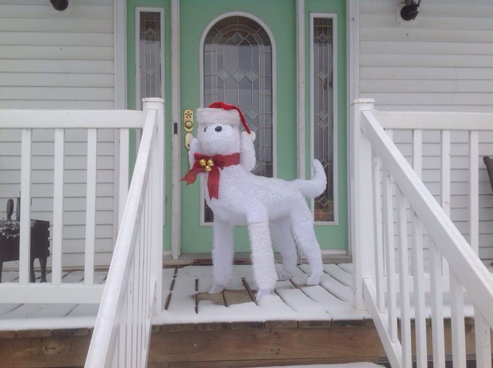 last year Home Depot had these lighted white poodles, we don’t use the front steps in the winter so I love her there blocking the door. I was shocked and pleased they had another color this year!! They look so cute at night!! I hope they do another color next year!! I love these!!!