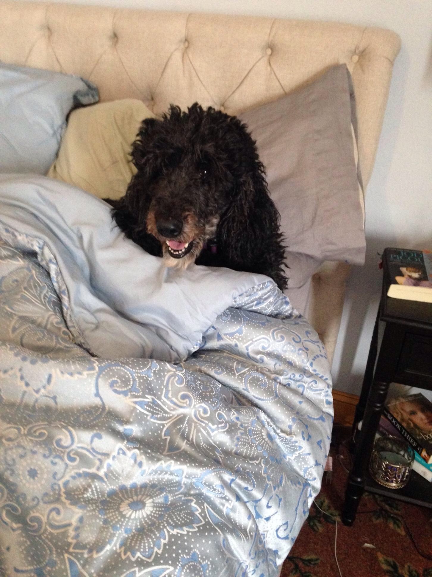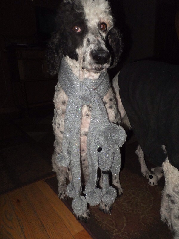 I love my poodle scarf made by Genia Dumont and thought Patti would look cute in it. So knowing she is SO tolerant of anything you do to her I wrapped it around her and adjusted it until I could get a good picture. Genia has a couple scarfs for sale , they make great gifts I can tell you how to get in touch with her if you want one I think she has a red and cream😀 SOOOO cold here, out to pee and back in!