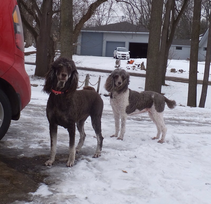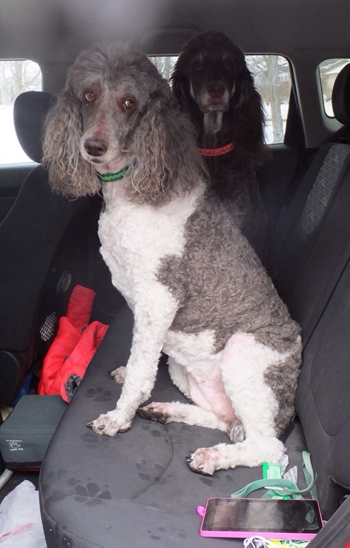 Citori and Izzie ( Lexie’s mother and litter mate) that live with Trisha, Ted and the twins in Lansing. We loaded some stuff in the back hatch of the Kia and went into the house leaving the girls outside. I noticed Citori out the window and quickly called her back into the house, but couldn’t find Izzie😳 ( panic mounting) Citori walked over to the car and drew our attention to the inside of the car where Izzie was calmly waiting to GO for a ride HAHA she must have jumped in over the back seat. Silly girl! Highness/Sophie doing great in her new home. Snuggling with her new poodle siblings, eating and TAILS UP!!