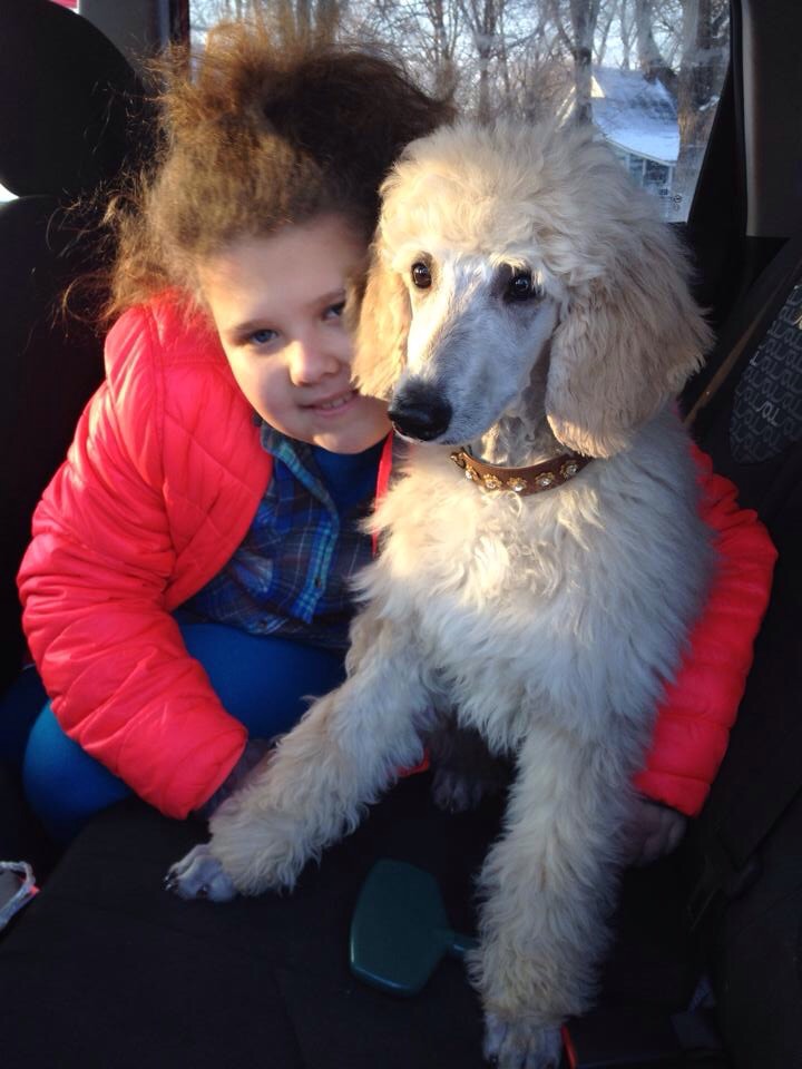 Citori and Izzie ( Lexie’s mother and litter mate) that live with Trisha, Ted and the twins in Lansing. We loaded some stuff in the back hatch of the Kia and went into the house leaving the girls outside. I noticed Citori out the window and quickly called her back into the house, but couldn’t find Izzie😳 ( panic mounting) Citori walked over to the car and drew our attention to the inside of the car where Izzie was calmly waiting to GO for a ride HAHA she must have jumped in over the back seat. Silly girl! Highness/Sophie doing great in her new home. Snuggling with her new poodle siblings, eating and TAILS UP!!