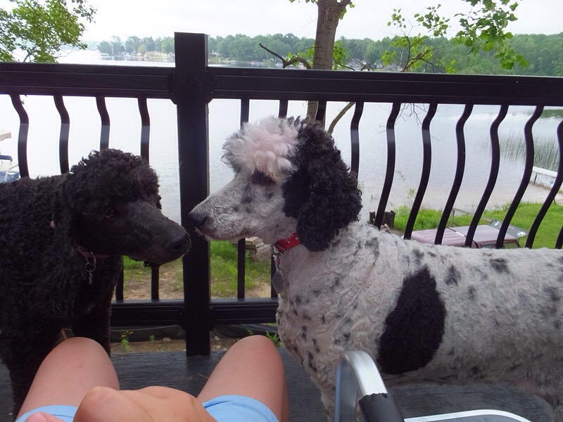 Shelby is still unsettled, we were at the manor ( named so because it’s a subdivision WEST COVE MANOR) the retirement home we are building across the lake and I needed to put a second coat of paint on the doors. We usually go to the park for a good run then to the manor for 3-4 hours of work. Shelby and Dennis were with us of course and Harlee swims. Shelby was fine ( well not really, okay and not pacing) as long as she could see Harlee in the water. I painted the front door and blocked it with a baby gate so it could dry and moved on to the back door. I heard a noise in the direction of the gate and thought Dennis had jumped over but it was Shelby, now in the water with Harlee haha. They stayed out there awhile and played then both came in to dry on the balcony. Thankfully Harlees mom said she could stay for the time we have Shelby or that poor dog would be miserable😩