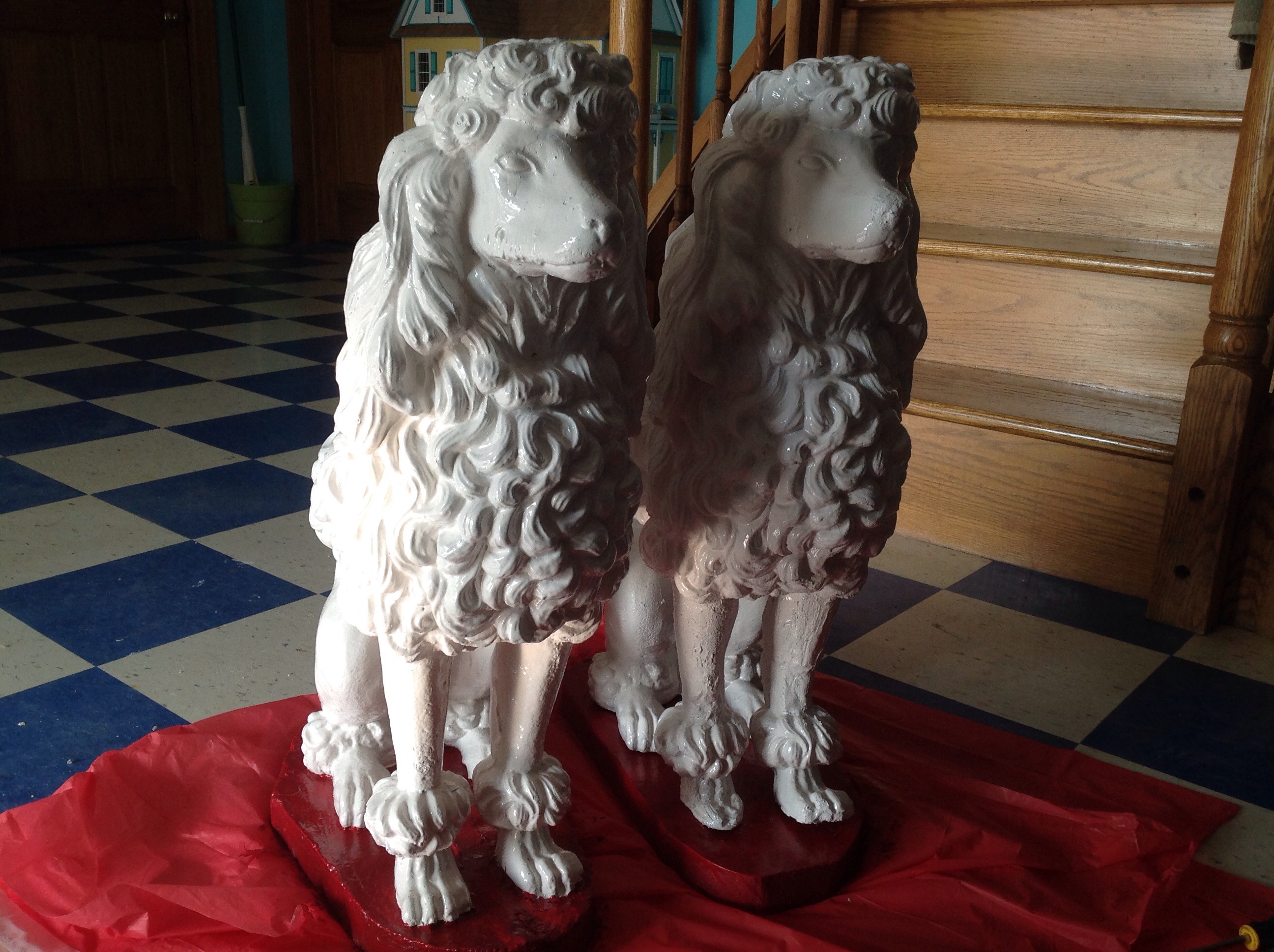 About 15 years ago I found these cement poodles , I was SO HAPPY when I found the first one and beyond thrilled when I found the second!! I had one on each side of the dock and since they were 90 lbs each I didn’t bring them in for the winter. While weed whacking I noticed one had damage to her front legs and set out to find something that could restore her to new. I needed something strong I could shape and Tom (men *sigh* every task is monumental) said there wasn’t a cement product that would do what I needed done. But I found a crack calk that worked! She’s not perfect but close enough! I’m not putting them back out in the weather, for now they will be on the front porch ( covered) of the new house. I’d love to get more of these for the park but so far haven’t found any, even stopping at places that sell cement stuff and showing them pictures. Someday maybe I’ll get lucky😀😍 I love them!!