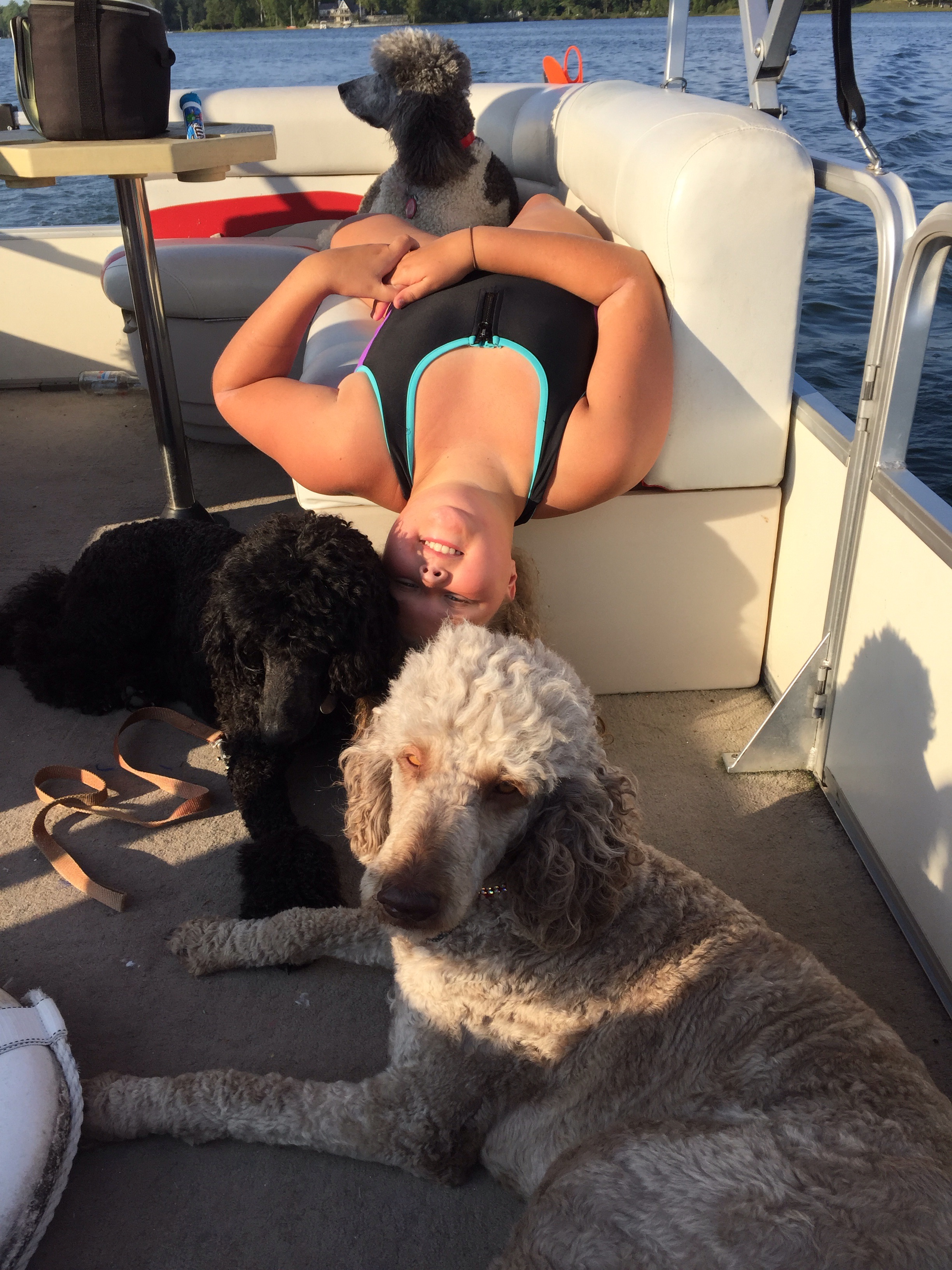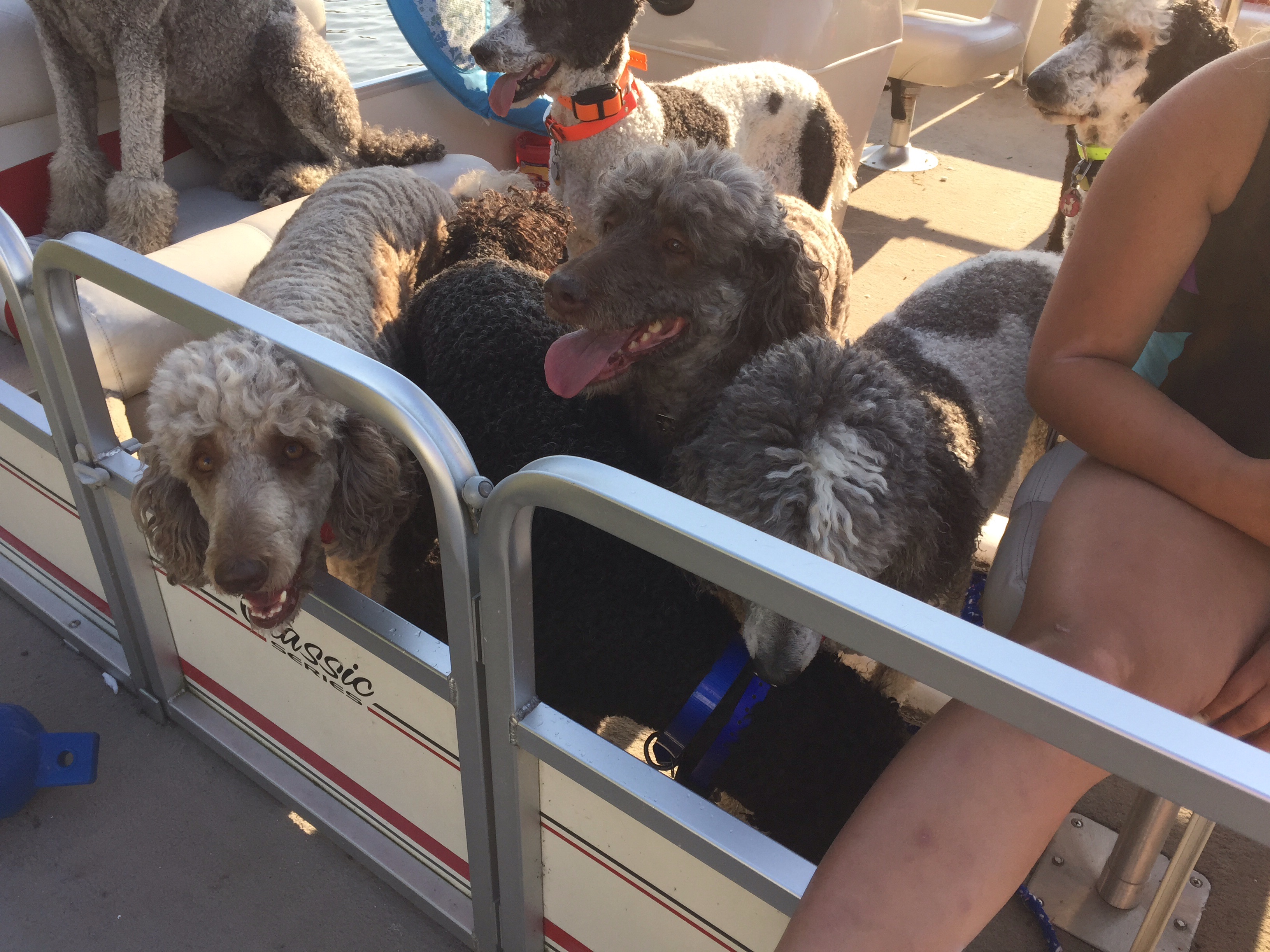 Waiting for their pontoon ride! Mindy and Tom are in Lansing so the girls are here with us. Since I don’t want Dennis to see her, he went swimming, she gets a boat ride. The other girls get frisky with her as they are all about to start their heats. Since Rosalie’s babies will be close to Halloween we changed the theme to HOCUS POCUS ( one of our favorite movies) Vet visit tomorrow hoping for good news about moving forward😀