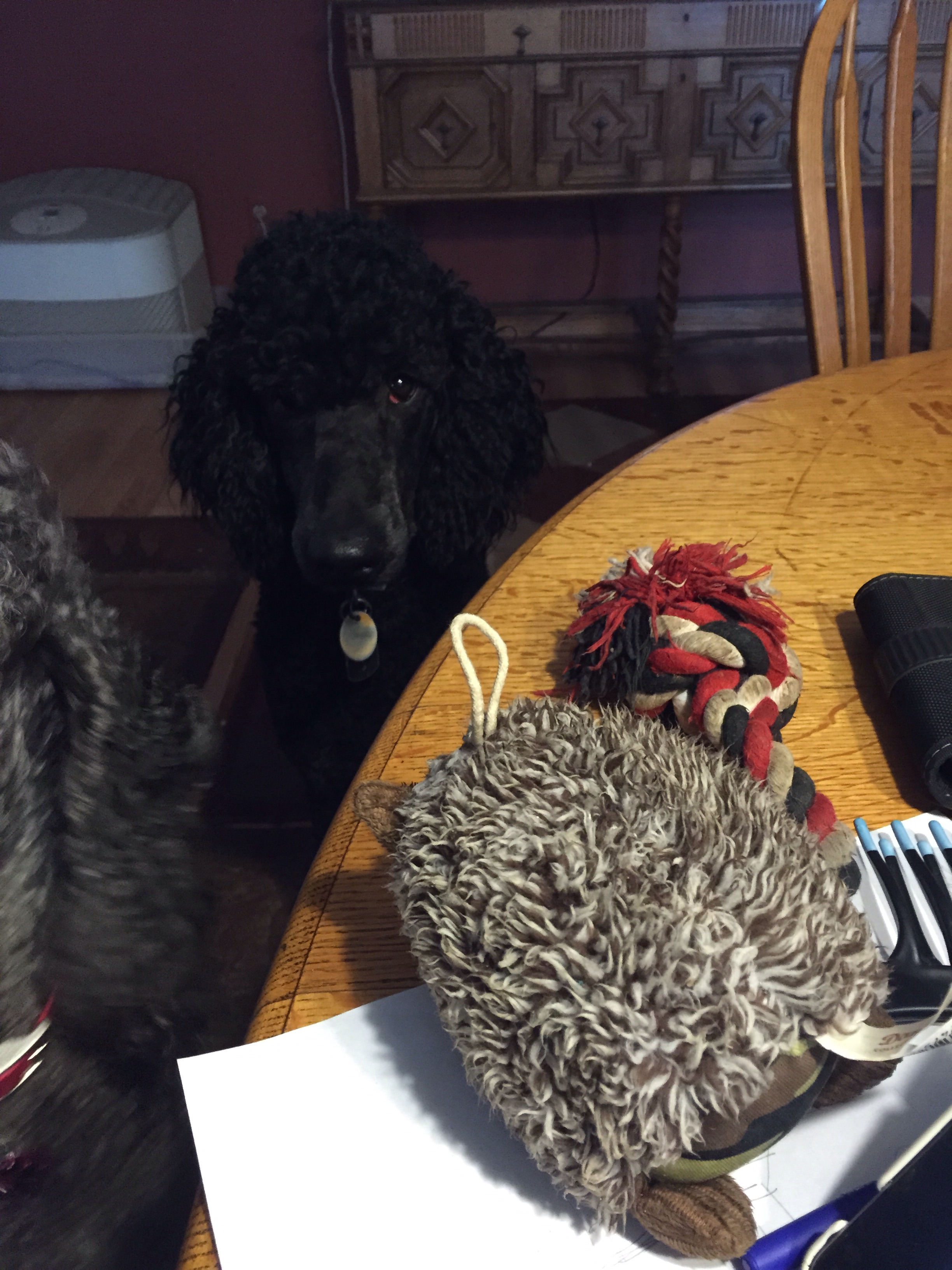 Dennis wants to play. So he puts his toys on the table knowing you will immediately throw them off haha. He is so darn cute and will be happy to go home Thursday. He’ll be back for Grace babies😀 He likes her! Licks her ears and kisses her ( he lives with her big sister Doris/Shelby) she ROARS when she’s had enough and he scrambles to get out of harms way ( she loves her Ruben ROAR) haha.