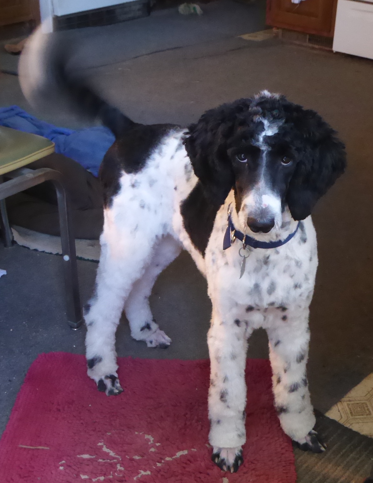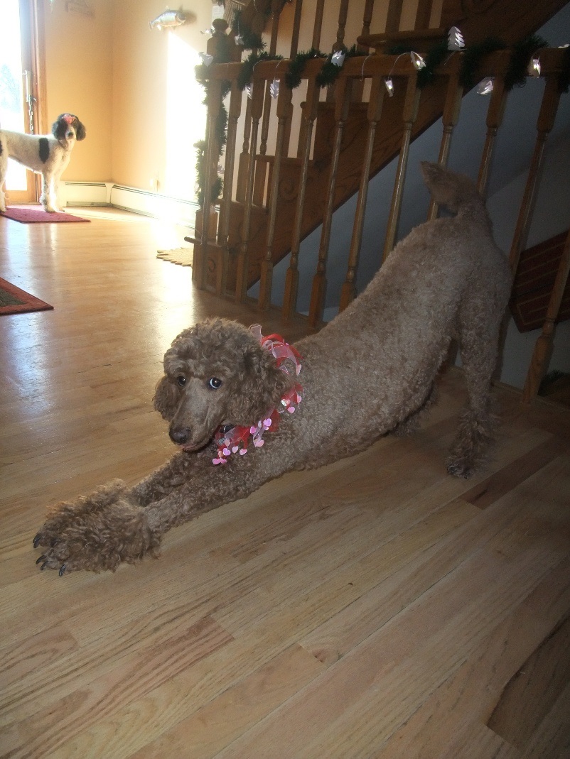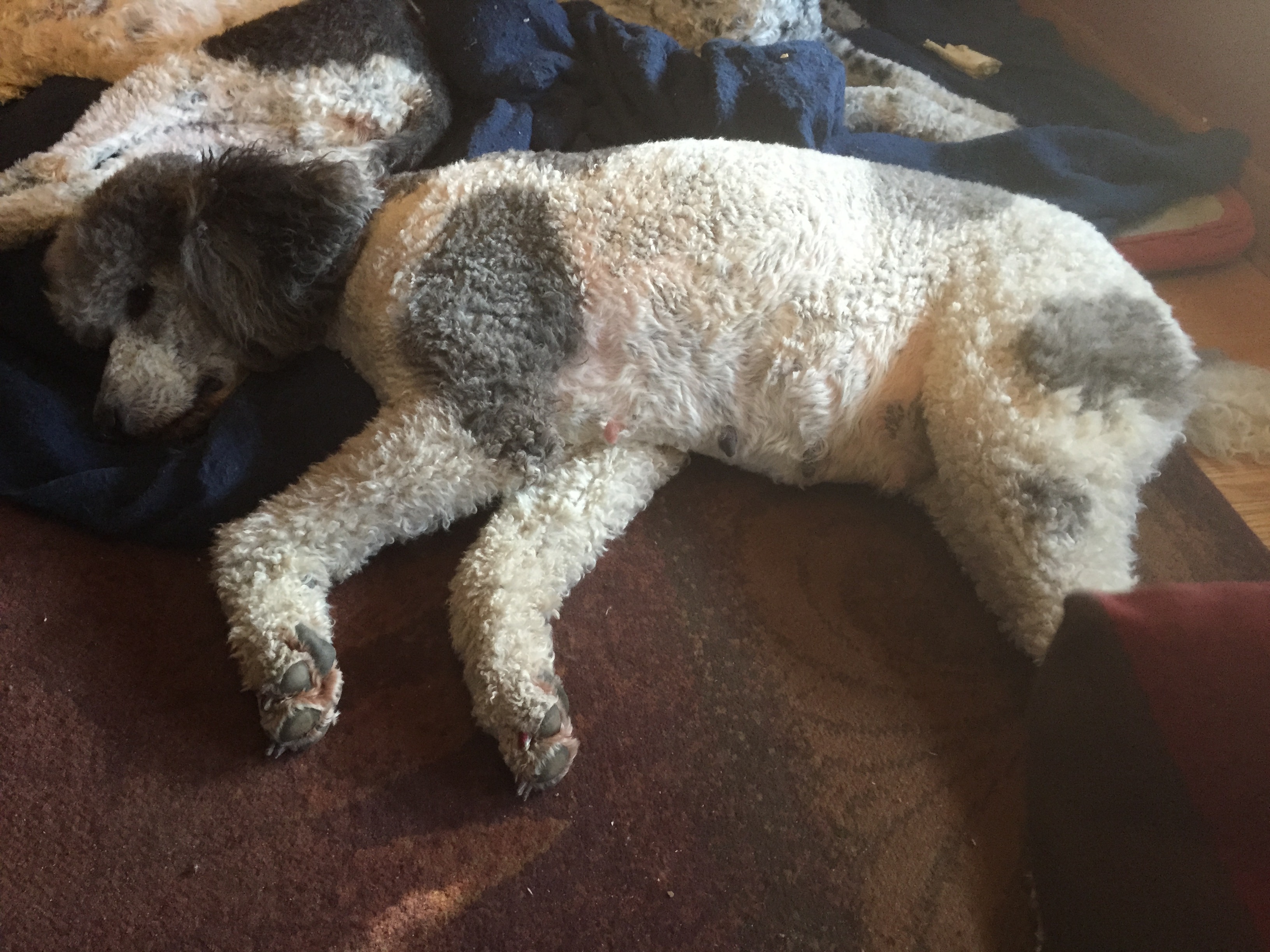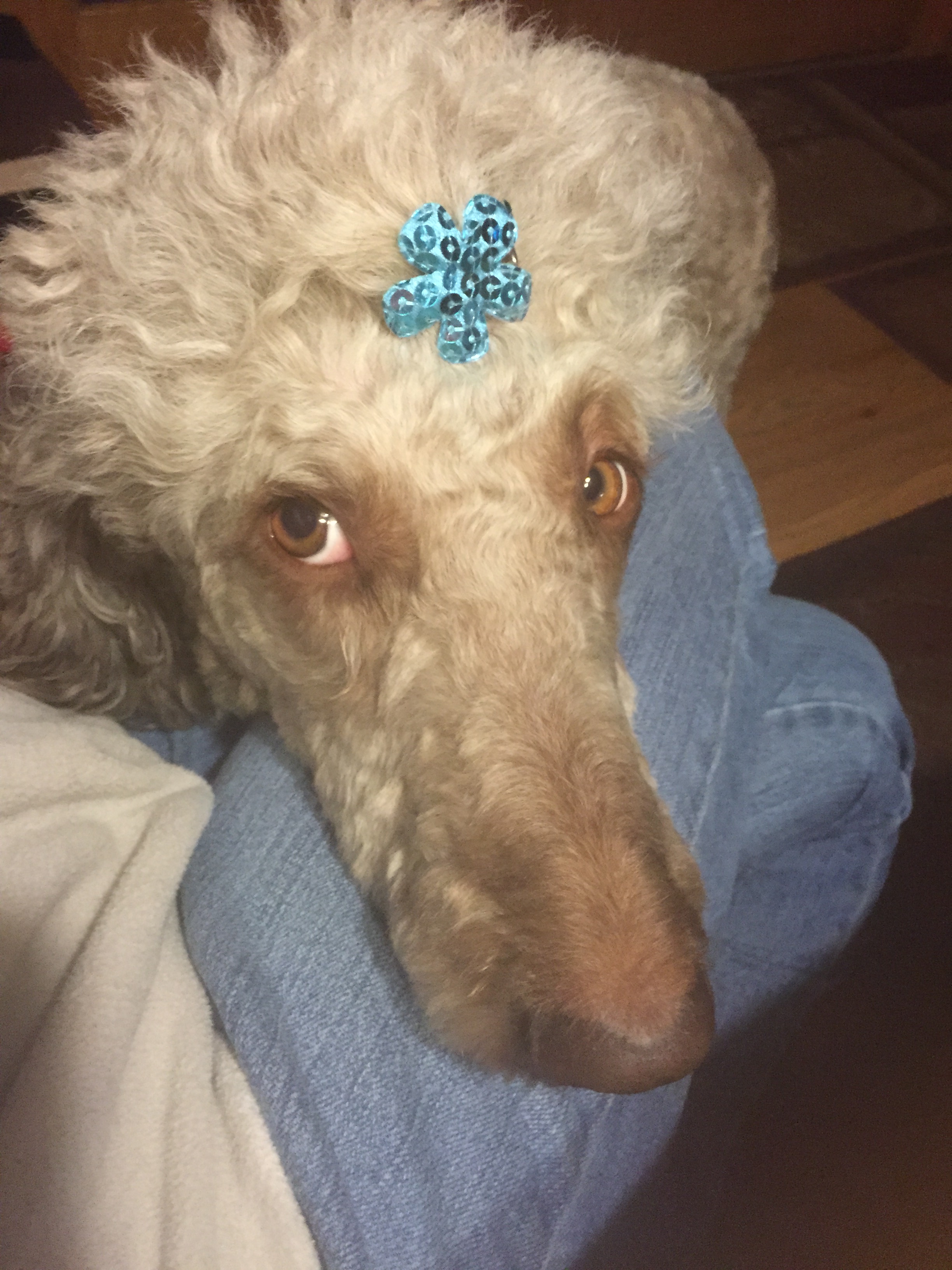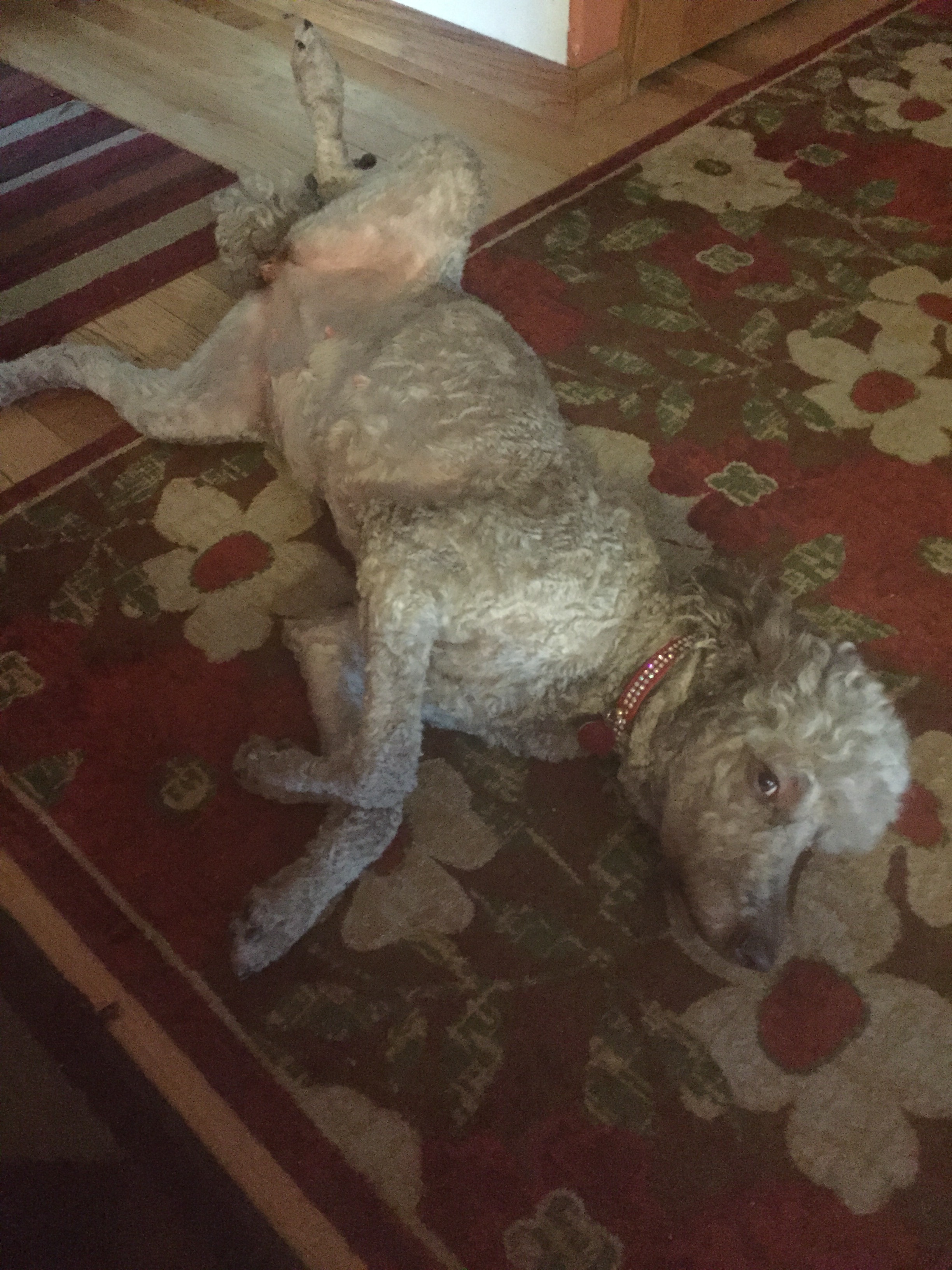 We laugh at how NEEDY Rosalie is, pampered every minute of her life she is sure your only mission in life is to pet her😀 She’s showing us her baby bump just starting to emerge. Little more than 3 weeks and we’ll have babies!!! She’ll be a good mom, she’s so sweet😘 Been a long time since we’ve had brown babies (a rare poodle color) WE’re counting the days to PUPPY BREATH!!